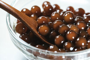 タピオカは、南米原産のキャッサバという芋から作られるでんぷんです。この白い粉を水で練って丸めたものが、私たちがよく知る粒状のタピオカパールになります。タピオカパールの特徴である黒い色は、製造過程でカラメルや黒糖を加えることで生まれるものです。弾力のある独特な食感が魅力で、ドリンクやお菓子に使われています。タピオカココナッツミルクのように、デザートとしてスプーンで食べるのが主流だった時期もありました。