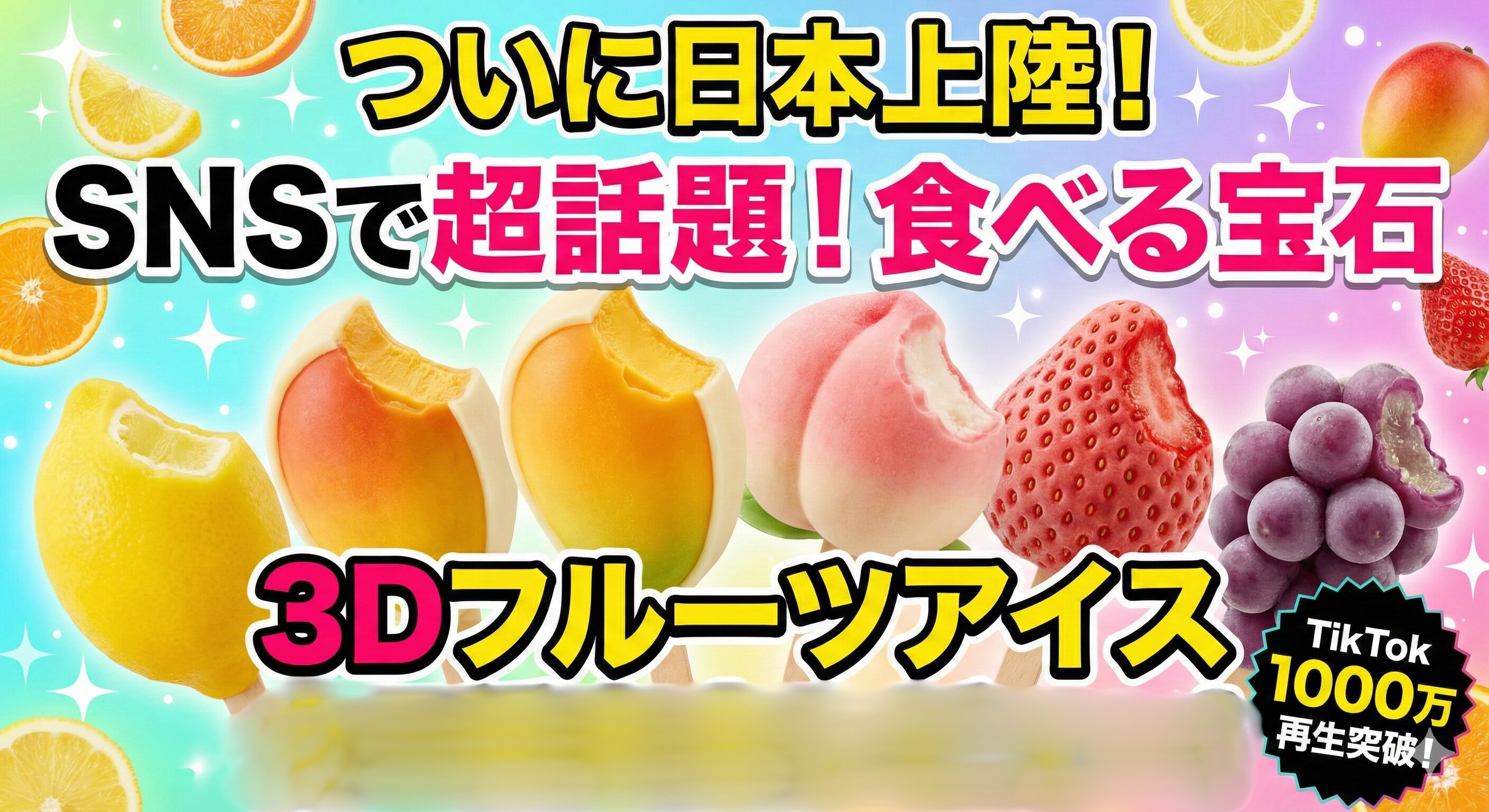 3Dフルーツアイスは、TikTokで1000万回以上再生されました。ASMR動画として、アイスをかじる音や断面を見せる映像が投稿されています。5種類のフレーバーを並べて食べ比べる動画も投稿されています。