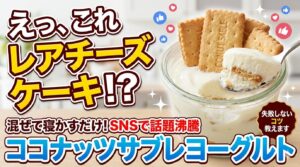 このアレンジは、ココナッツサブレがヨーグルトの水分を吸収することで、チーズケーキのような食感と風味になる現象を利用したものです。ビスケットの甘みとヨーグルトの酸味が調和することで、まるでチーズケーキのような味わいが生まれます。