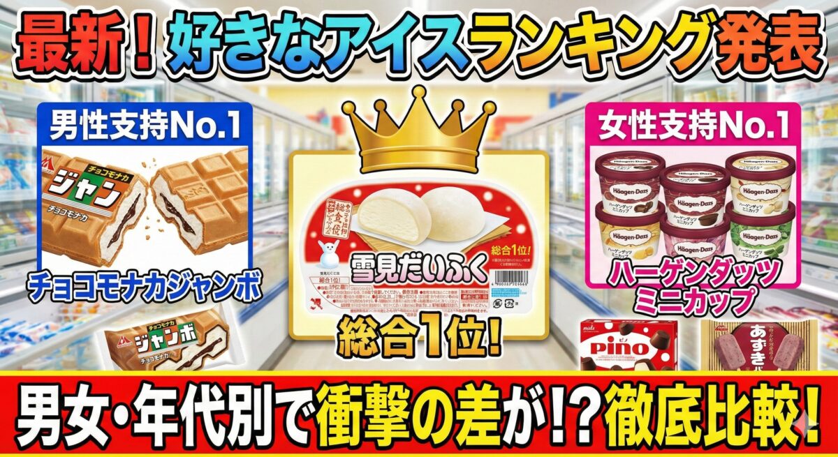 LINEリサーチが2025年6月に実施した調査で、スーパーやコンビニで販売されているアイスの中から好きなものについて、15歳から69歳までの男女3149人を対象に調査が行われました。調査結果から、全体では「雪見だいふく」が1位となりましたが、男女や年代によって好まれるアイスに違いがあることが明らかになりました。